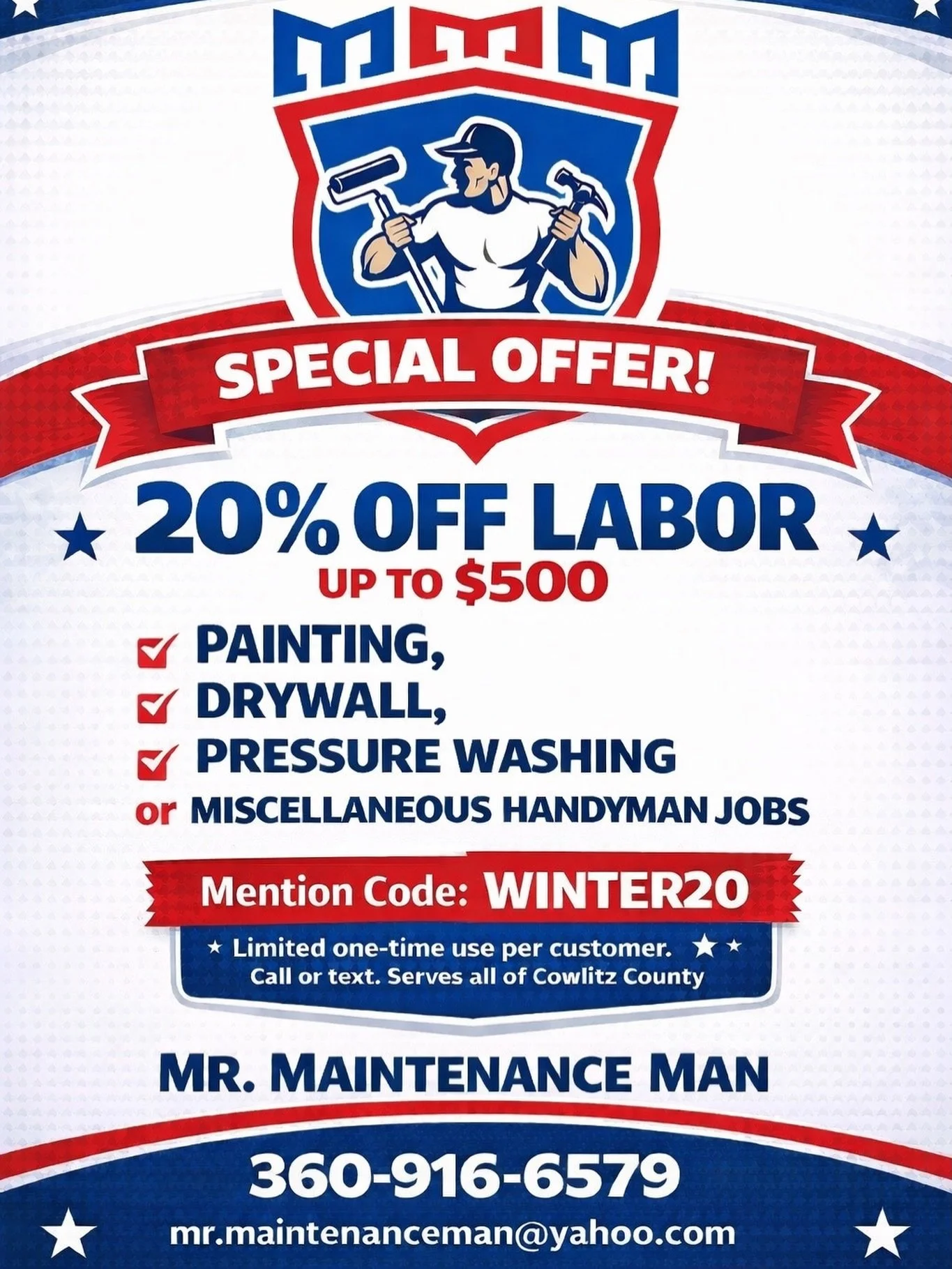 “ Need a hand, Call Mr. Maintenance Man.” Serving Cowlitz County Washington State Check out our latest projects View fullsize View fullsize View fullsize View fullsize View fullsize View fullsize View fullsize View fullsize View fullsize View fullsize View fullsize View fullsize View fullsize View fullsize View fullsize View fullsize View fullsize View fullsize View fullsize View fullsize CONTACT